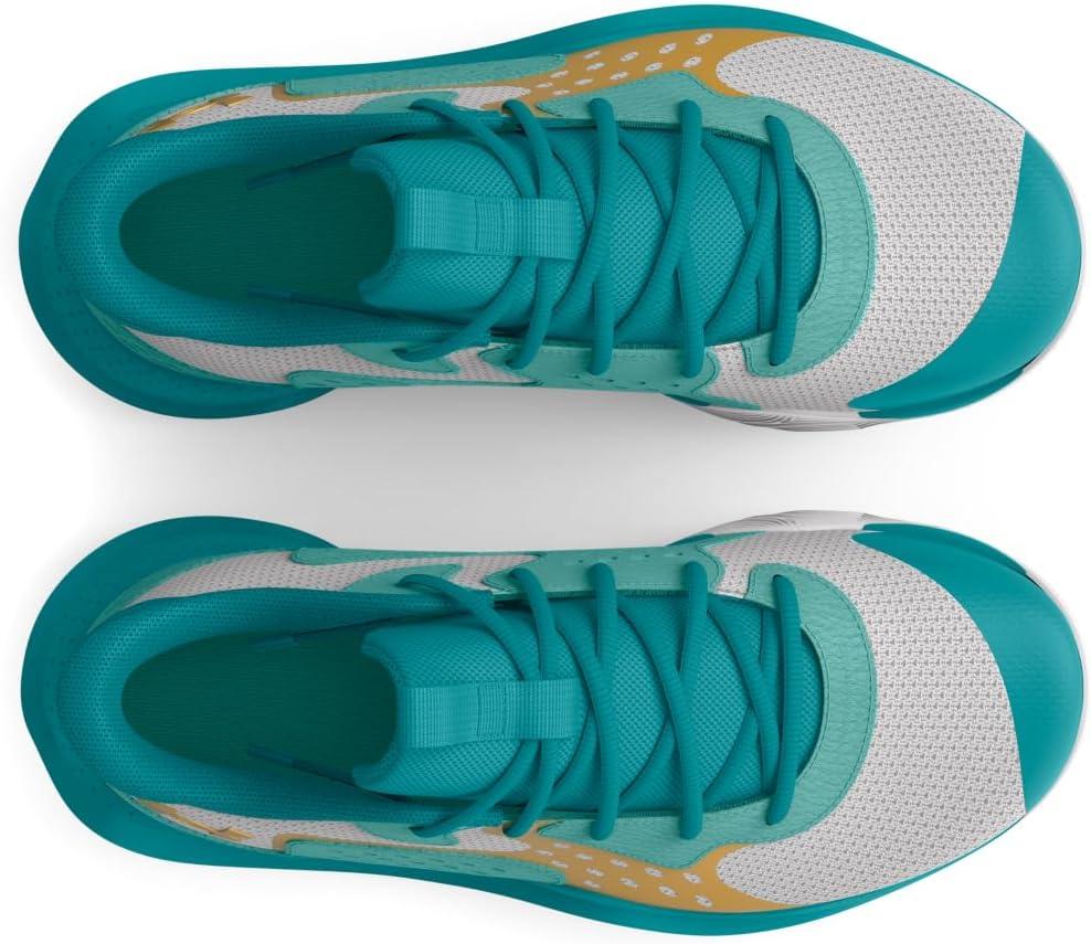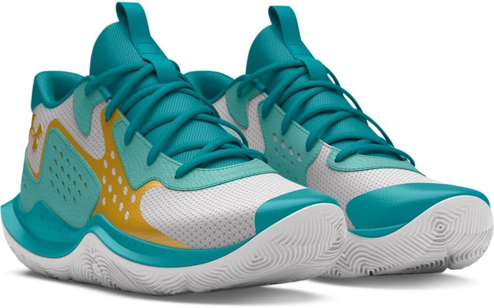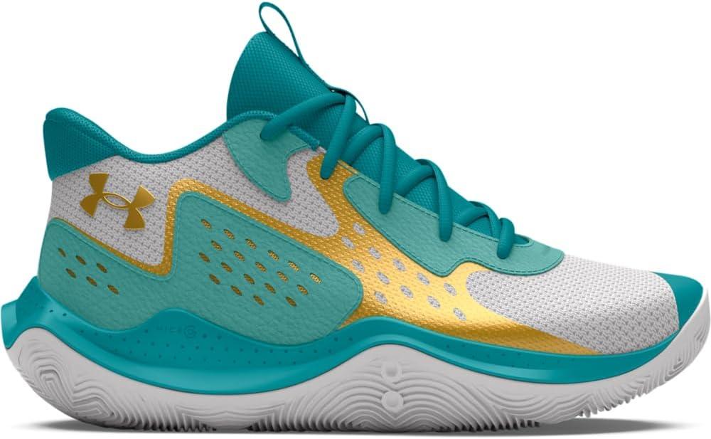Under Armour Kids’ Grade School Jet ’23 Basketball Shoe((103) Distant Gray/Circuit Teal/Metallic Gold)