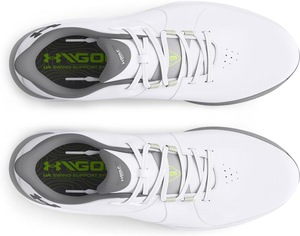 UA Swing Support System (S3) provides smarter traction, dual-foam cushioning & lockdown lacing. Swing Support Strap combines with reinforcement in the upper to provide biomechanically correct lock-in. Energy-returning UA HOVR™ foam + supportive Charged Cushioning® guides natural motion of the foot in a golf swing. Hybrid TPU + rubber outsole for ideal combination of penetrating traction & underfoot comfort. Outsole has strategic flex grooves, directional traction & rubber up the side for added support at impact. Updated fit with more room at the ball of the foot for improved comfort & stability. Molded sockliner for enhanced fit & comfort. Weight: 12 oz. Lace type: Standard tie.