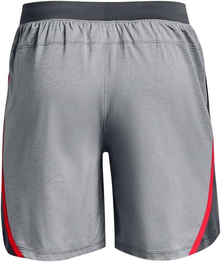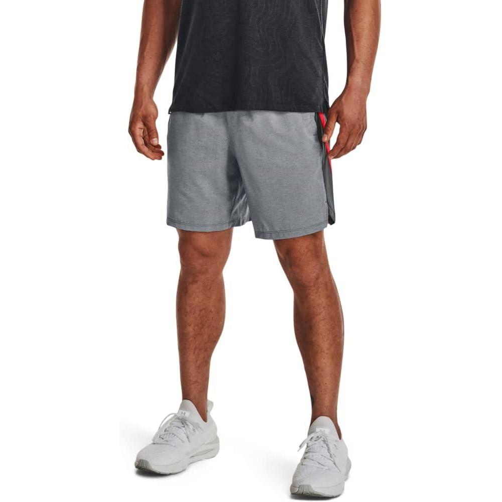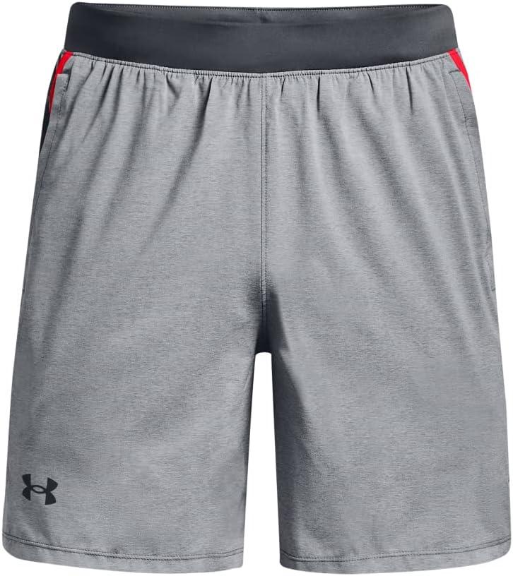 Under Armour Men’s Launch Stretch Woven 7-inch Shorts((016) Pitch Gray Full Heather / Bolt Red / Reflective)