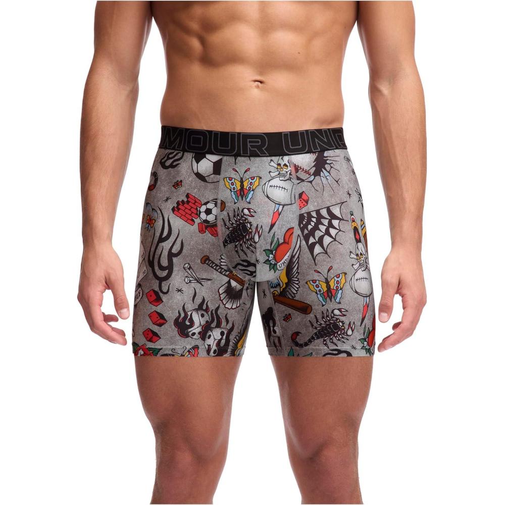 Under Armour mens Performance Tech Mesh Print Singles, 6" Inseam Boxer Brief(Black/Grey)