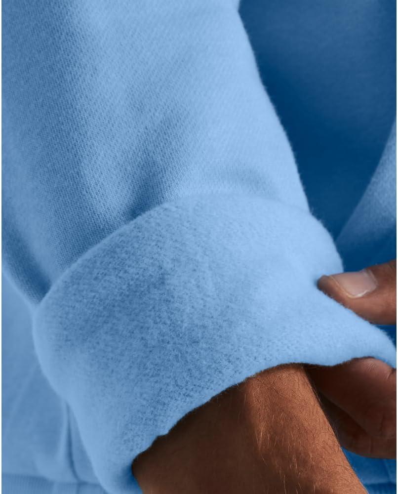 Midweight, 280g durable cotton-blend fleece. Soft, brushed inside traps warmth. Breathable mesh hood liner. Front kangaroo pocket. Contrast cover stitching.
