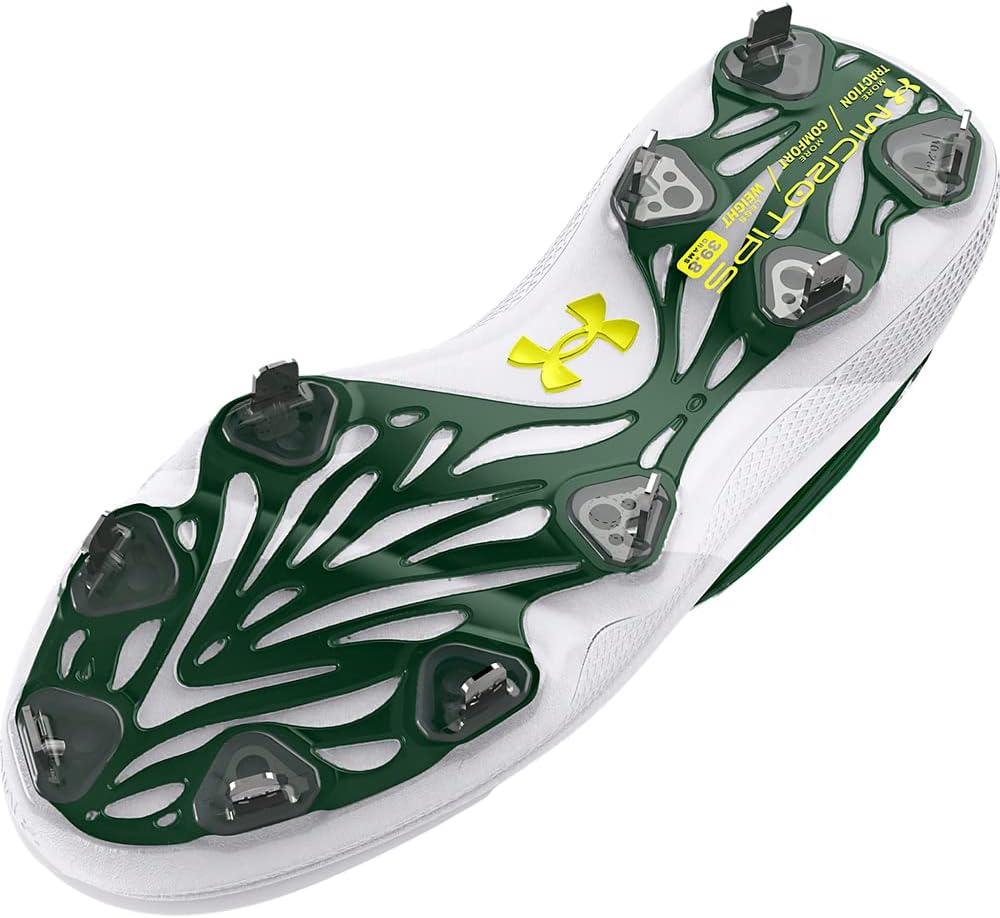 Updated plush heel, engineered textile forefoot & breathable toe box make it fit & feel like a sneaker. TPU cage for added stability during lateral movements. Toe drag protection & strategic TPU overlays in high-abrasion areas for durability that lasts all season. Molded Ortholite™ sockliner maintains compression set for long-lasting comfort & improved traction. Charged Cushioning® midsole converts impact into explosive speed & power on the diamond. New UA Microtips technology provides comfort, more traction & less weight underfoot. 10 strategically placed cleats on perimeter for more points of ground contact to reduce cleat pressure. Weight: 12.3 oz.. Lace type: Standard tie. .