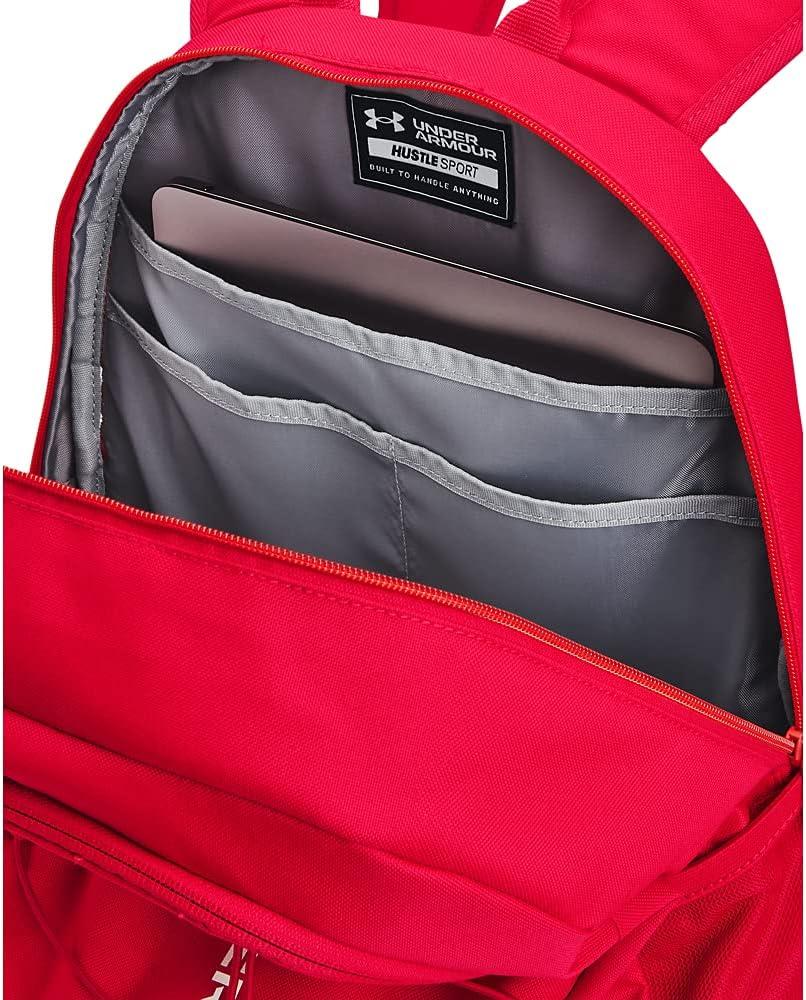 imageUnder Armour UnisexAdult Hustle Sport Backpack 433 Tech BlueTech BlueWhite One Size Fits AllRed 600Metallic Silver