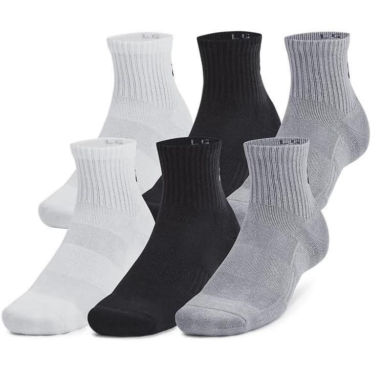 Yes, they're cotton socks—but they work harder than any other cotton socks you've worn. They wick sweat so your foot feels cooler, while still giving you that incredible comfort and cushioning you expect from regular cotton. Lightweight, soft cotton-blend fabric for all-day comfort. Material wicks sweat & dries really fast. Locked-in fit design keeps sock securely on heel for an adjustment free fit that won't fall down. Medium cushioning placed strategically throughout foot protects high-impact areas without added bulk. Mesh panels on top of foot for added breathability. Built-in arch support helps reduce foot fatigue. 6 pairs of socks. . . . 69% Cotton/29% Polyester/2% Elastane.
