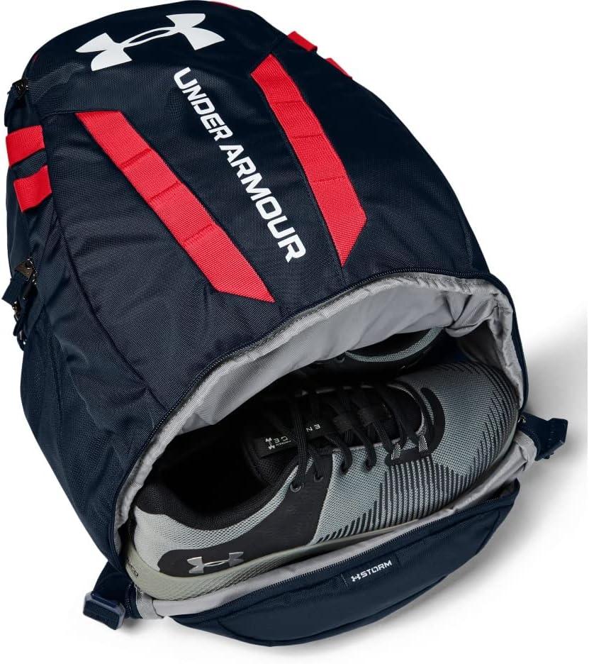 This backpack does it all. It's water-repellent for the rain, tough as nails, comfortable as anything, and has all the pockets you need to hold all your stuff. 100% Polyester. Nylon lining. 15″ shoulder drop. UA Storm technology delivers an element-battling, highly water-resistant finish. Breathable air-mesh padded back panel & adjustable, HeatGear shoulder straps for total comfort. Soft-lined laptop sleeve-holds up to 15″” MacBook Pro or similarly sized laptop. Water-repellent front valuables pocket to keep your stuff safe. Large, gusseted front laundry/shoe pocket placed at bottom of bag (fits pair of shoes up to size 15). 2 D-Rings & molle webbing on shoulder straps for additional attachment points. Two side water bottle pockets. Tough, abrasion-resistant bottom panel. Dimensions When Full: 6.3″”W x 20.1″”H x 12.6″”L. Volume: 1,769.7 Cubic In. / 29 L