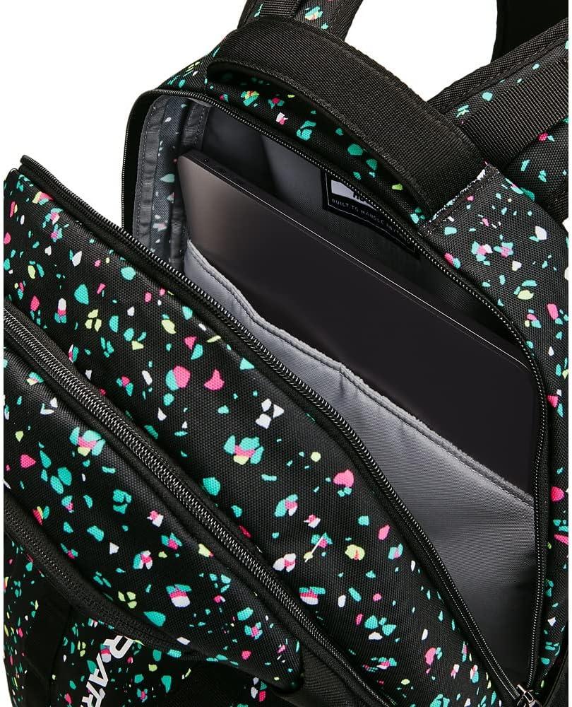 This backpack does it all. It's water-repellent for the rain, tough as nails, comfortable as anything, and has all the pockets you need to hold all your stuff. 100% Polyester. Nylon lining. 15″ shoulder drop. UA Storm technology delivers an element-battling, highly water-resistant finish. Breathable air-mesh padded back panel & adjustable, HeatGear shoulder straps for total comfort. Soft-lined laptop sleeve-holds up to 15″” MacBook Pro or similarly sized laptop. Water-repellent front valuables pocket to keep your stuff safe. Large, gusseted front laundry/shoe pocket placed at bottom of bag (fits pair of shoes up to size 15). 2 D-Rings & molle webbing on shoulder straps for additional attachment points. Two side water bottle pockets. Tough, abrasion-resistant bottom panel. Dimensions When Full: 6.3″”W x 20.1″”H x 12.6″”L. Volume: 1,769.7 Cubic In. / 29 L