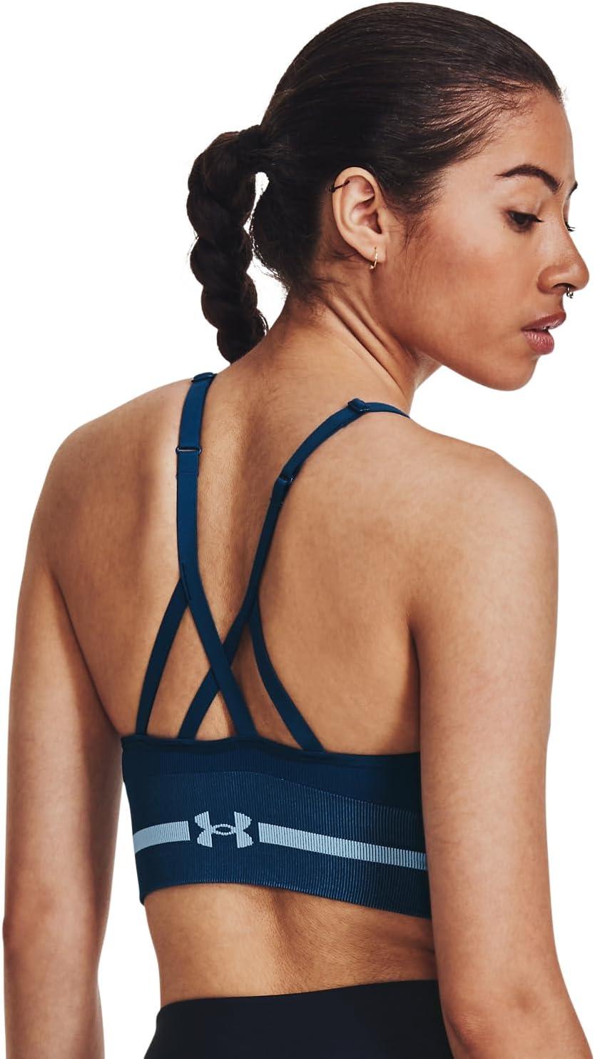 Delivers strategic support, tailored for low-impact activities like yoga, pilates & hiking. UA Seamless is a soft knit with engineered ventilation, mapped to the places you need it most. Soft, removable cups for enhanced shape & coverage. Skinny strap pullover with adjustable cross back design. Wide jacquard wordmark band for amazing stretch & comfort. Material wicks sweat & dries really fast. 4-way stretch construction moves better in every direction