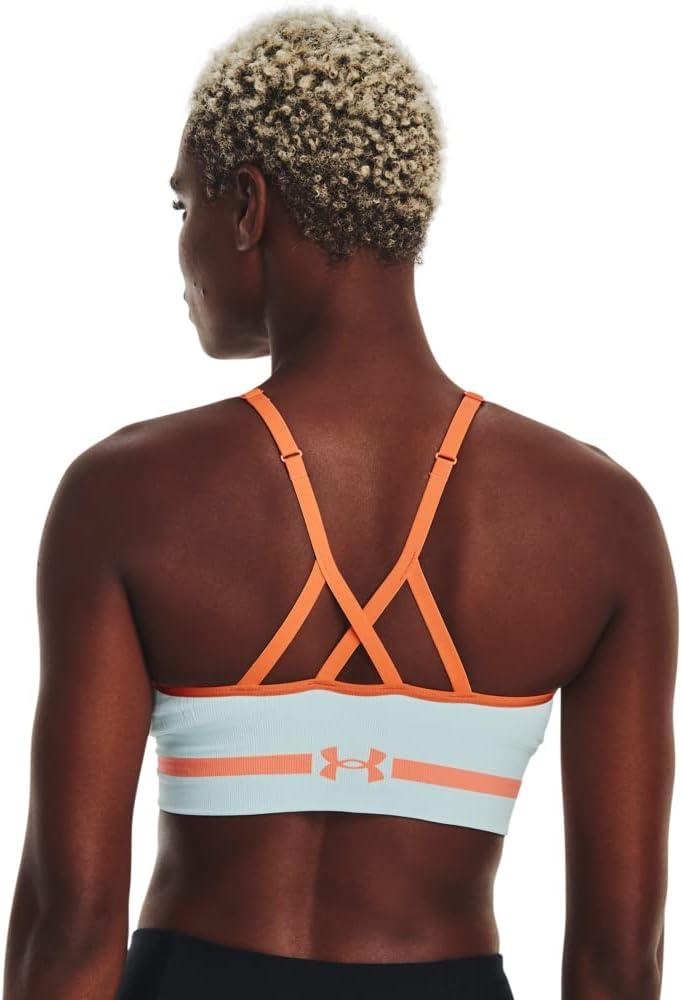 Delivers strategic support, tailored for low-impact activities like yoga, pilates & hiking. UA Seamless is a soft knit with engineered ventilation, mapped to the places you need it most. Soft, removable cups for enhanced shape & coverage. Skinny strap pullover with adjustable cross back design. Wide jacquard wordmark band for amazing stretch & comfort. Material wicks sweat & dries really fast. 4-way stretch construction moves better in every direction