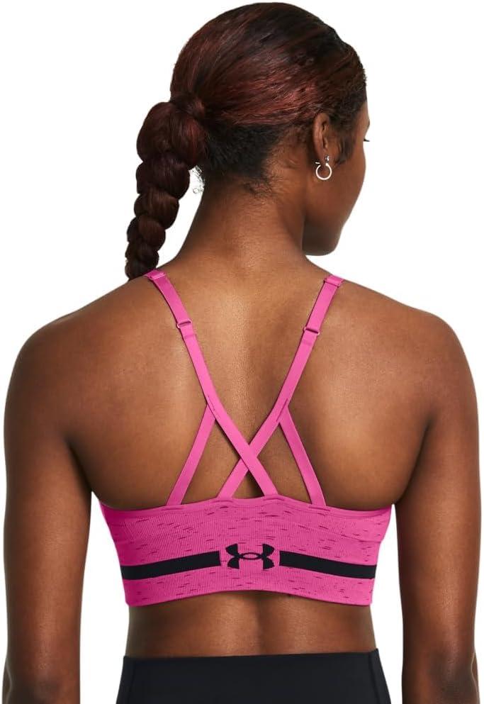 Delivers strategic support, tailored for low-impact activities like yoga, pilates & hiking. UA Seamless is a soft knit with engineered ventilation, mapped to the places you need it most. Soft, removable cups for enhanced shape & coverage. Skinny strap pullover with adjustable cross back design. Wide jacquard wordmark band for amazing stretch & comfort. Material wicks sweat & dries really fast. 4-way stretch construction moves better in every direction