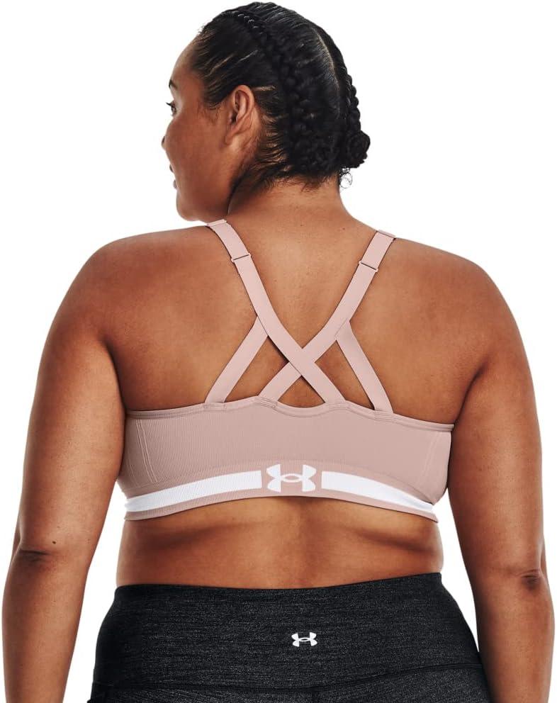 Delivers strategic support, tailored for low-impact activities like yoga, pilates & hiking. UA Seamless is a soft knit with engineered ventilation, mapped to the places you need it most. Soft, removable cups for enhanced shape & coverage. Skinny strap pullover with adjustable cross back design. Wide jacquard wordmark band for amazing stretch & comfort. Material wicks sweat & dries really fast. 4-way stretch construction moves better in every direction